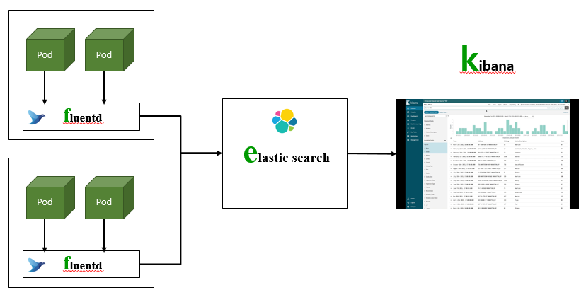 EFK스택은 엘라스틱서치Elasticsearch, 플루언트디Fluentd, 키바나Kibana의 앞자를 모은 용어이고 ELK스택은 엘라스틱서치Elasticsearch, 로그스태시Logstash, 키바나Kibana의 앞자를 모은 용어입니다.