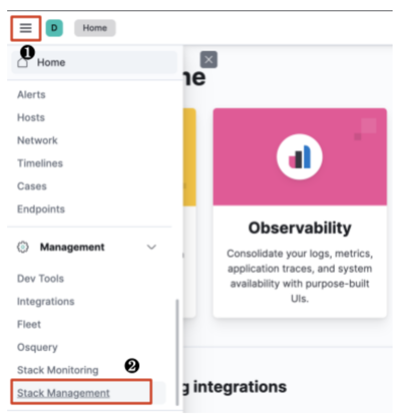 키바나 홈의 ❶ 좌측 상단에 있는 햄버거 메뉴를 클릭하고 ❷ Management > Stack Management를 클릭 하십시오.