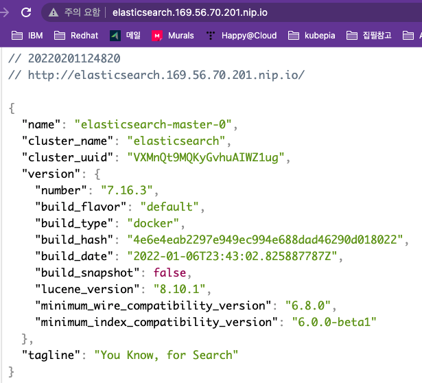 | [root@osboxes efk]# k get svc NAME TYPE … PORT(S) elasticsearch-master ClusterIP … 9200/TCP,9300/TCP elasticsearch-master-headless ClusterIP … 9200/TCP,9300/TCP [root@osboxes efk]# k get ing NAME CLASS HOSTS … elasticsearch-master nginx elasticsearch.169.56.70.201.nip.io … |