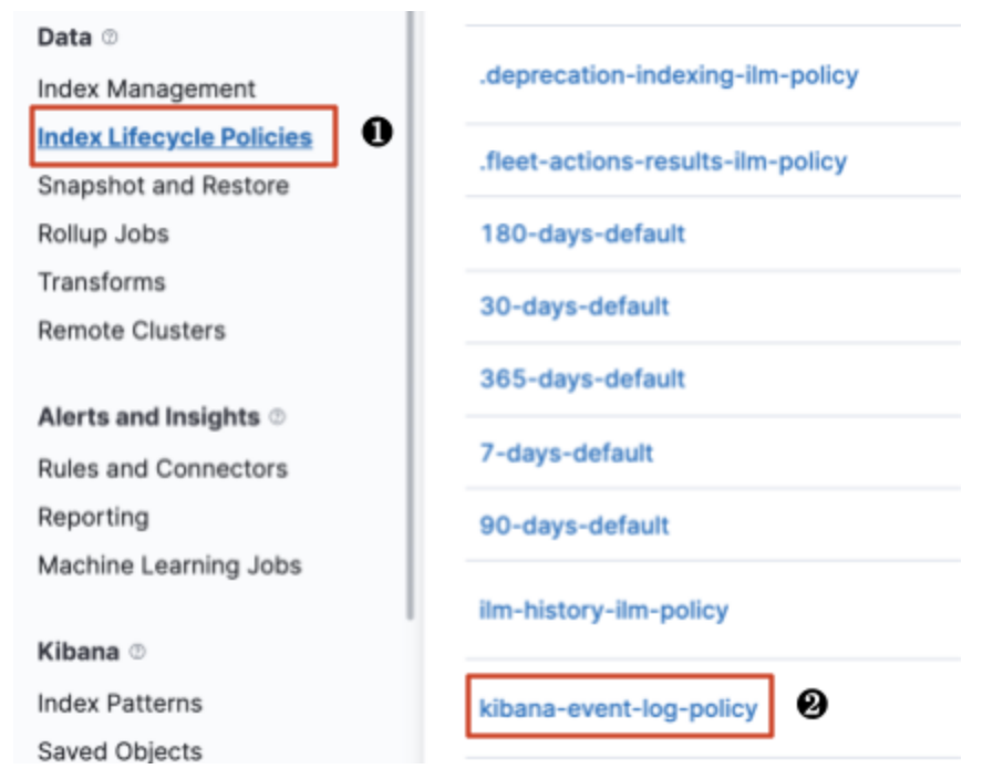 ❶ Data > Index Lifecycle Policies을 클릭하고 ❷ kibana-event-log-policy를 선택 합니다.