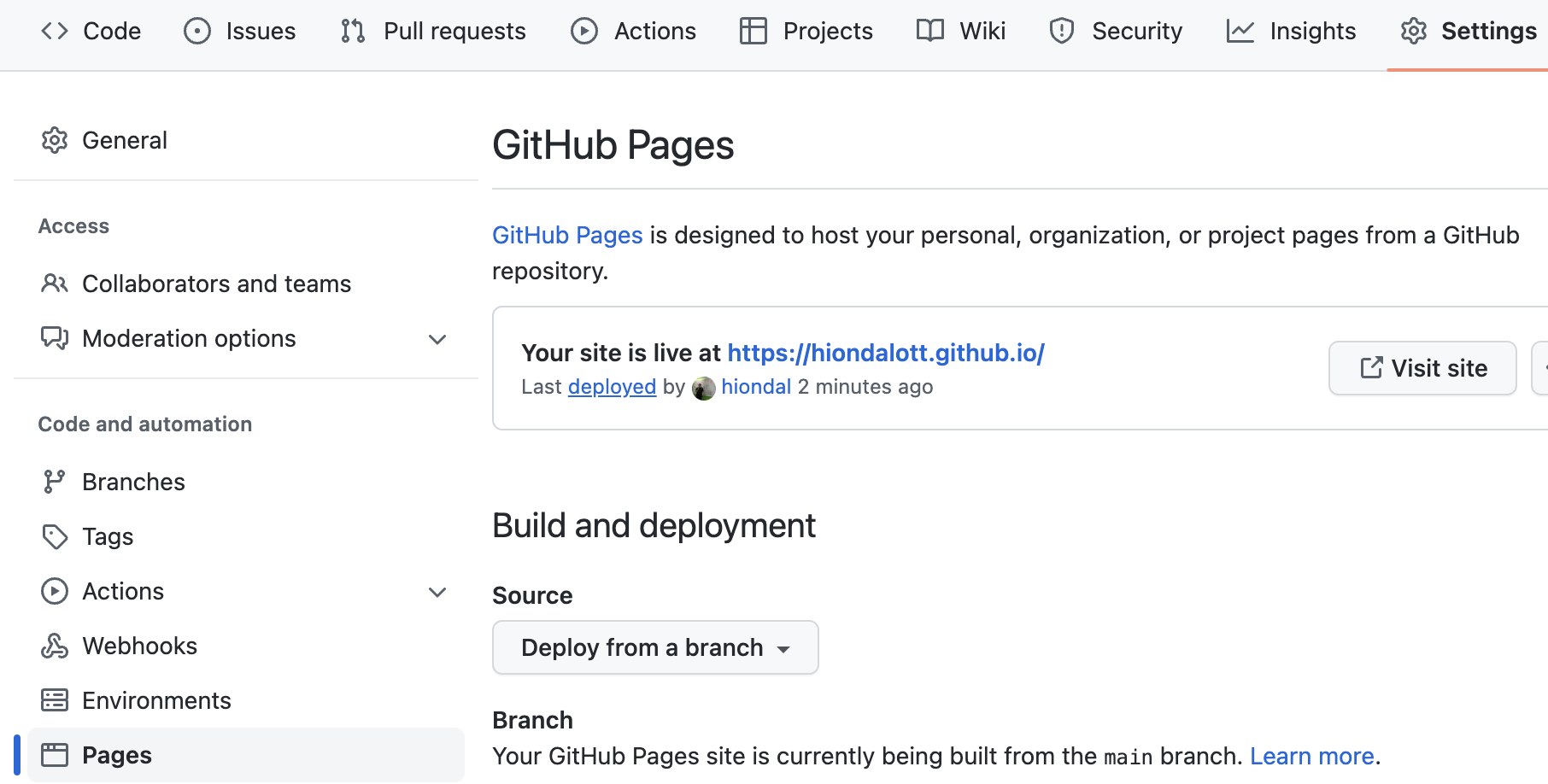 레포지토리 [Settings]를 누르고 [Pages]를 눌러보면 아래 예와 같이 GihHub Page가 만들어진걸 확인할 수 있습니다.