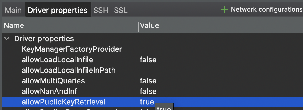 - 만약 연결이 안되는 경우 (로컬이 아닌 별도 서버에 설치한 경우) 'Dirver Properties'탭에서 'allowPublicKeyRetrieval'값을 'true'로 변경 하세요.