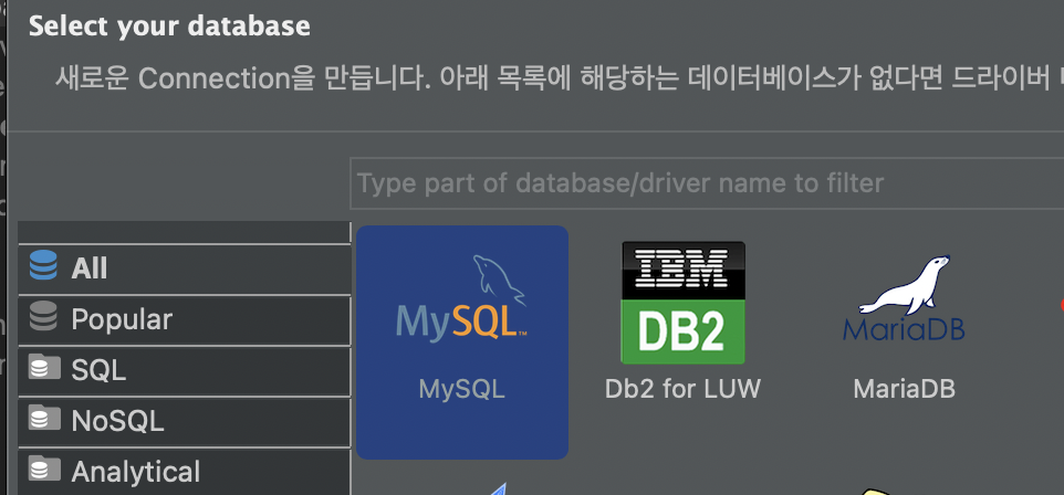 설치 후 실행하면 Connection을 만드는 다이알로그가 뜰 것입니다. 'MySQL'을 선택 하세요.