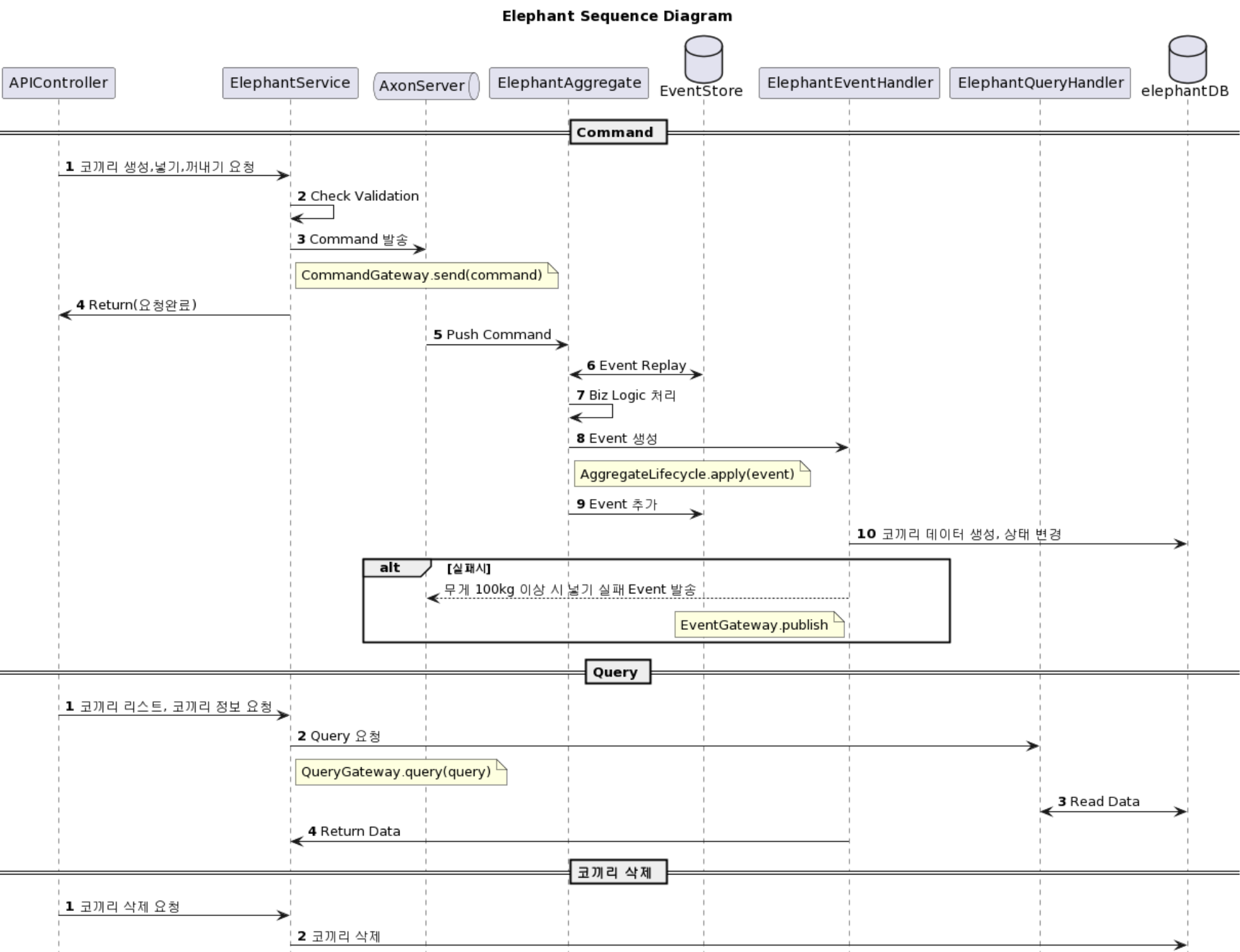 예제 소스를 아래 repository에 있습니다. 실습은 Command, Query, 코끼리 삭제의 순서대로 개발하면서 설명하겠습니다.