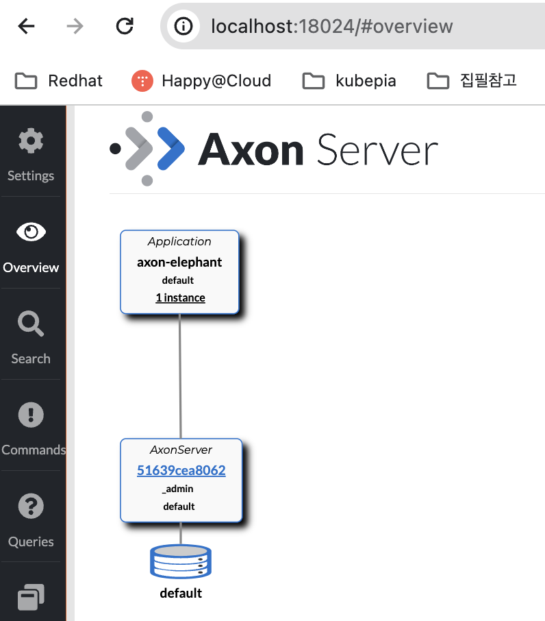 'Overview' 메뉴를 클릭하면 Axon Server의 참여 어플리케이션으로 등록된 것을 볼 수 있습니다.