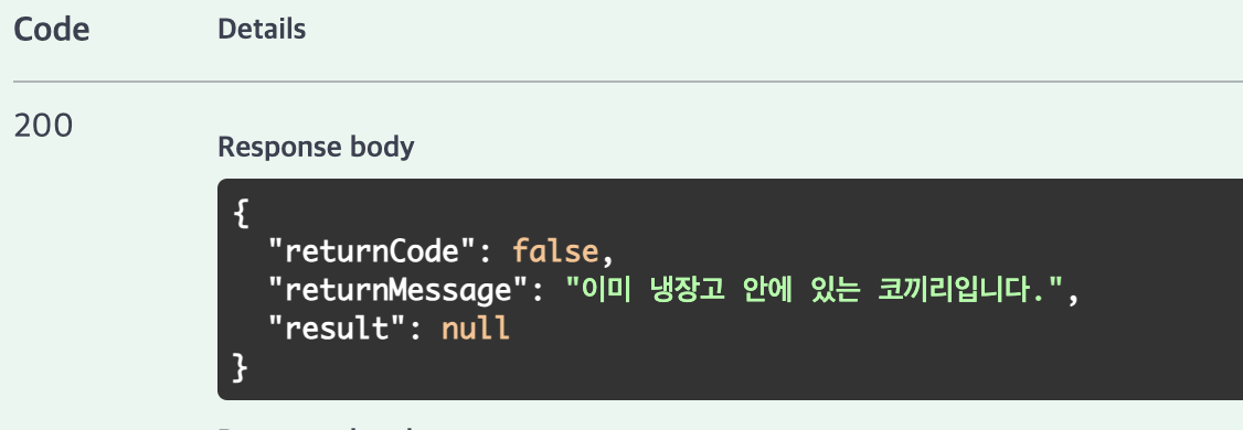 retVo.setReturnMessage("이미 냉장고 안에 있는 코끼리입니다.");