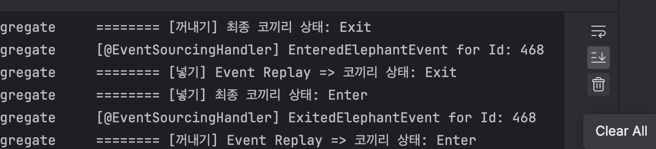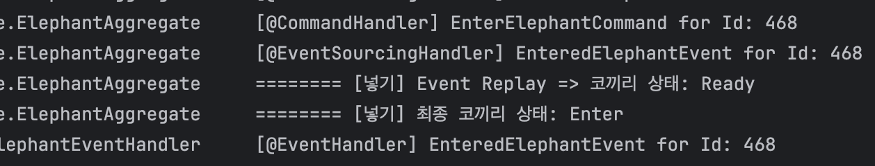 ElephantAggregate의 EventSourcingHandler가 처음 'CreatedElephantEvent'부터 시작해서 지금까지의 Event를 Replay하는 걸 확인할 수 있습니다.