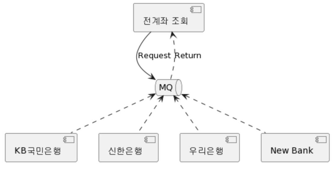 각 은행은 MQ 채널에 Query요청이 오면 응답을 MQ로 보내고 되고, MQ는 '전계좌 조회'서비스에 결과를 리턴하게 됩니다.