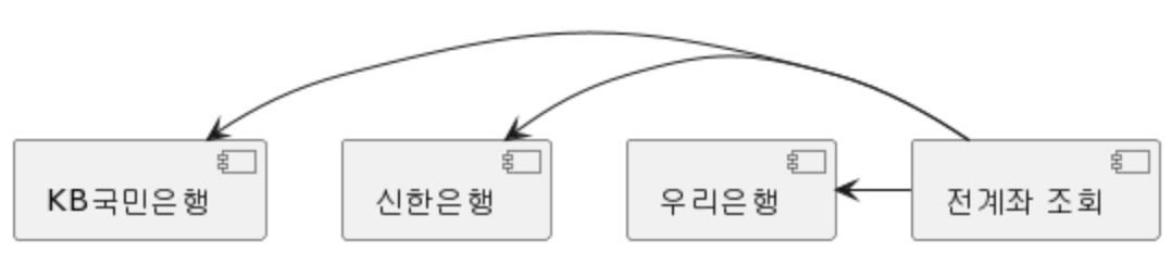 동기 통신이라면 아래와 같이 '전계좌 조회'서비스에서 각 은행 계좌 서비스에 요청을 해야 합니다.