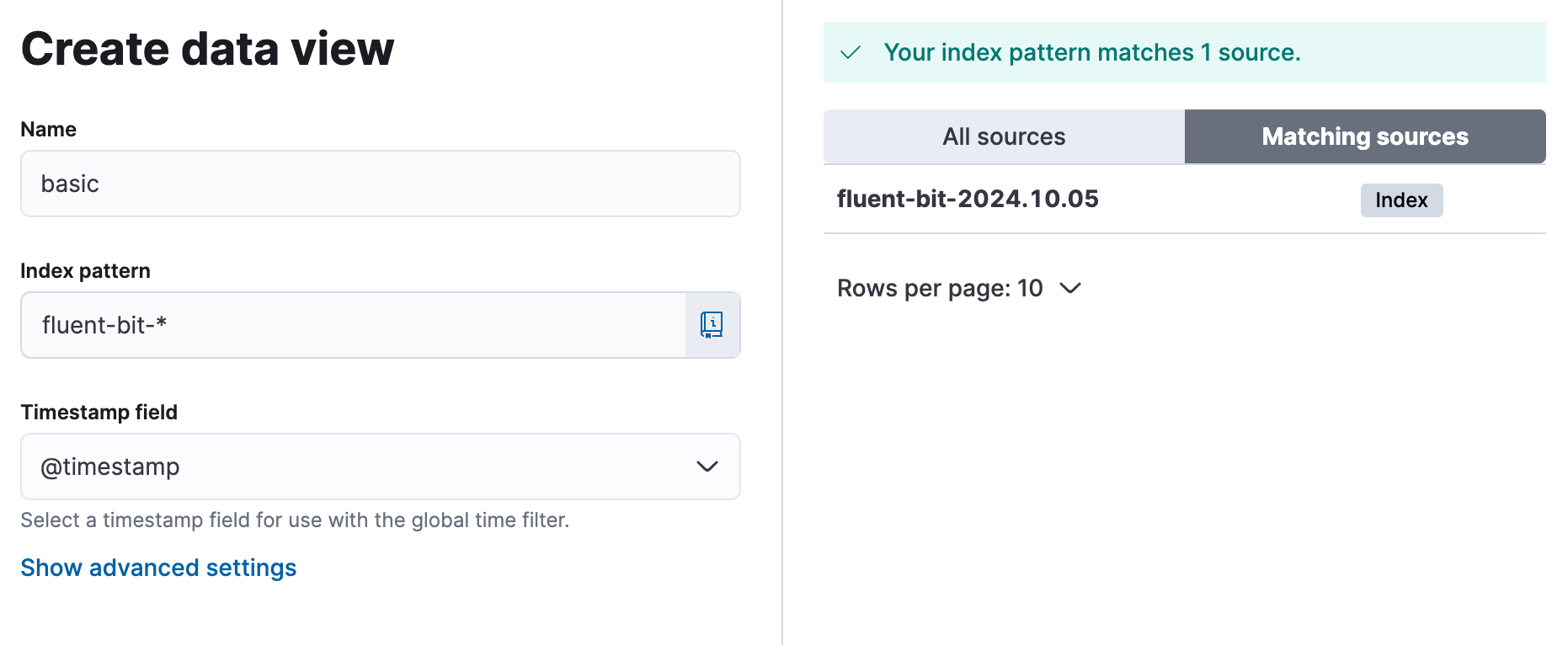 Fluent bit가 수집하여 Elasticsearch DB에 저장한 데이터의 index pattern을 생성합니다.