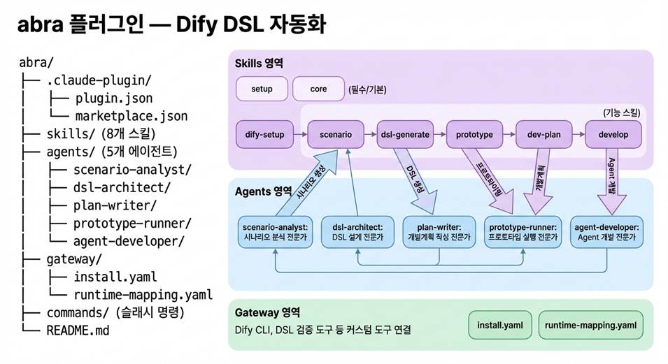 abra 플러그인 구조 — 5개 에이전트와 8개 스킬의 협업