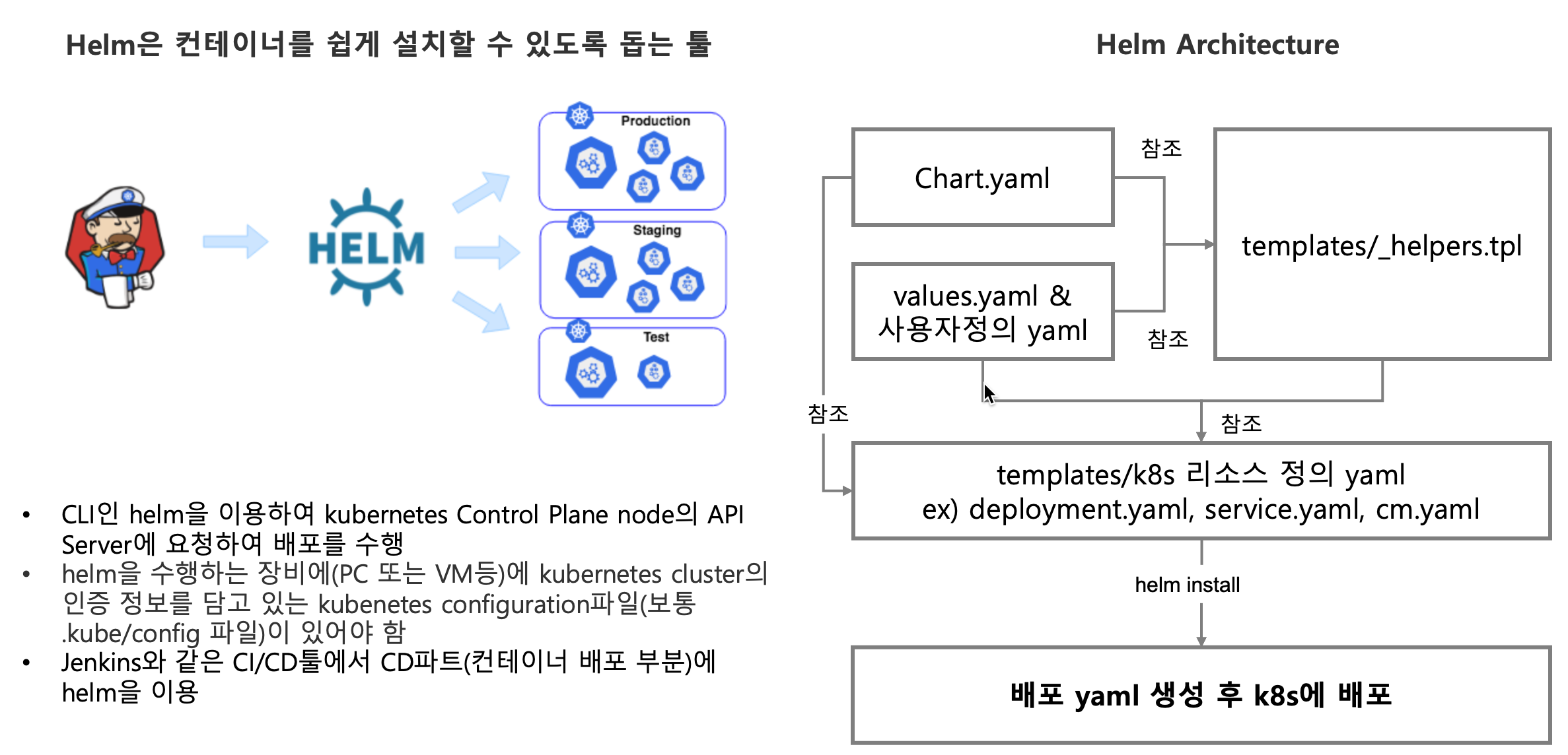 Jenkins와 같은 CI/CD툴에서 CD파트(컨테이너 배포 부분)에 helm을 이용할 수 있습니다.