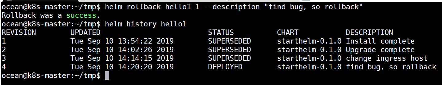 # helm rollback hello1 1helm rollback hello1 1 --description "find bug, so rollback"