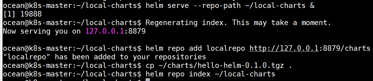 $ helm repo add localrepo http://127.0.0.1:8879/charts