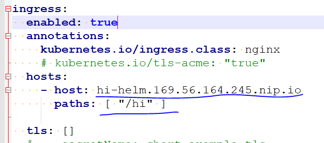 - ingress.hosts.secret : TLS 지원을 위해 domain(chartrepo.169.56.164.245.nip.io)을 위한 Secret 지정. domain의 IP는 본인 k8s master VM IP로 바꿔줘야 함.