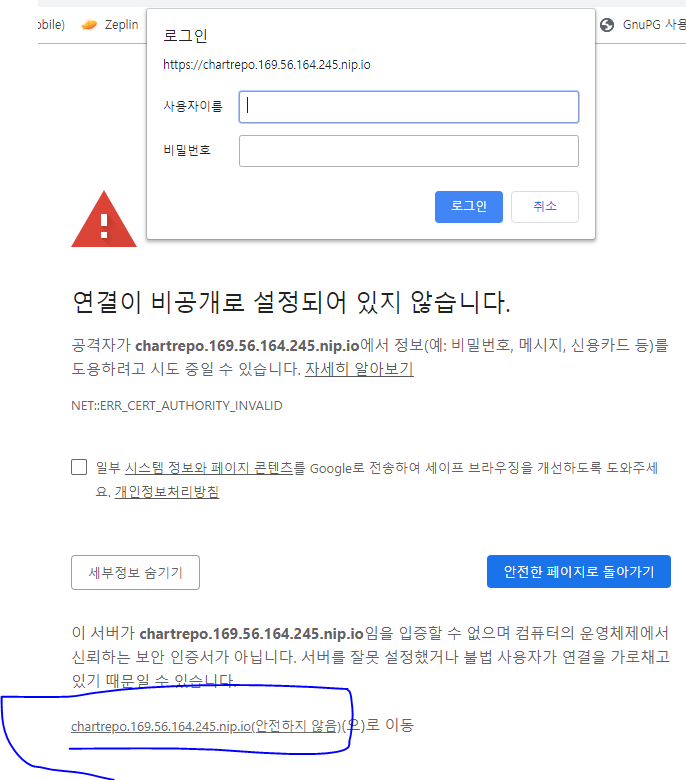 위 명령 수행 후 Common Name에 ingress domain(위 예에서는 chartrepo.169.56.164.245.nip.io)을 넣고, 암호는 아무거나 넣으십시오.