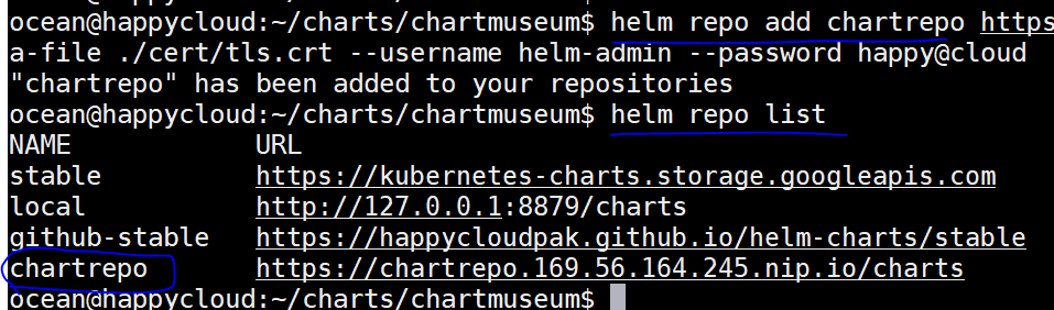 $ helm repo add chartrepo https://chartrepo.169.56.164.245.nip.io/charts --ca-file ~/cert/chartmuseum/tls.crt --username helm-admin --password happy@cloud