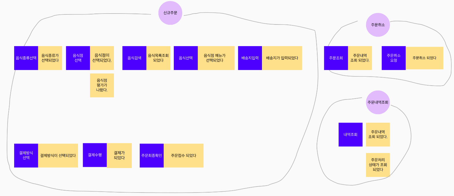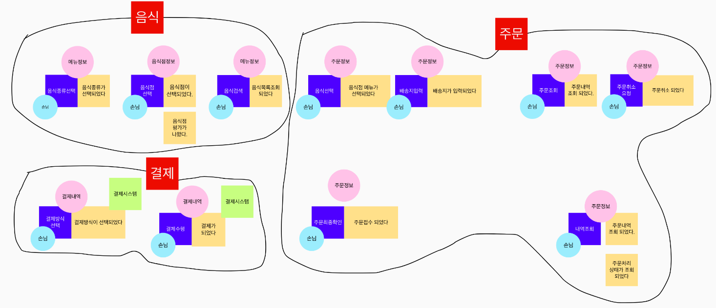 | - Entity, command, event, actor, Policy/Rule을 보면서 어떤 주제와 관련되었는지를 논의 합니다. - 바운디드컨텍스트는 사용자, 프로세스, 정책/규정 등을 고유한 비즈니스 목적별로 그룹핑한것입니다. Entity, command, event, actor, Policy/Rule을 보면서 어떤 주제와 관련되었는지를 논의 합니다. 프로세스 그룹핑한것도 참조합니다. - 그 주제별로 경계를 선으로 구분합니다. 처음에는 흐린색 펜으로 그리고 확정되면 검은색 마커팬으로 그립니다. - 그 주제명, 즉 Bounded Context의 명칭을 "분홍색" 포스트잇에 적어 붙입니다. * 이해를 돕기위해 필요하면 UI를 포스트잇에 그려 붙일수 있습니다. |