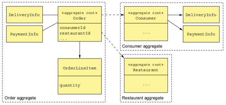 | Aggregate 이해하기 한 단위로 취급 가능한 경계 내부의 도메인 객체로서 한개의 루트엔터티와 기타엔터티+Value Object로 구성됩니다. 쉽게말해, Aggregate는 고유의 비즈니스 목적 수행을 위한 데이터 객체들의 집합입니다. 예를 들면 피자주문DOMAIN의 Aggregate에는 Order, Consumer, Restaurant가 있습니다. Order Aggregate에는 Order, DeliveryInfo, PaymentInfo라는 Entity가 있고, Order Entity는 OrderLineItem(메뉴별 주문량)이라는 VO와 연결됩니다. Order와 OrderLineItem은 1:N의 관계가 됩니다. ![]() [출처] 마이크로서비스패턴 (크리스리처드슨 지음) Aggregate 규칙: RPO - Root only-Aggregate Root만 참조: Aggregate내부의 entity나 VO를 접근할 때 직접하지 말고 Aggregate root를 통해서 해라 - Primary key-참조는 Primary key 사용: 다른 Aggregate를 참조할때 객체자체를 레퍼런스하지 말고 객체의 primary key로 참조해라. Order는 Consumer 객체 자체를 참조하지 않고, consumerId값으로 Consumer aggregate를 참조함. - One to One -한 개의 트랜잭션은 한 개의 Aggregate만 Writing 마지막 규칙은 동일한 서비스안의 RDBMS에서는 1:N이 될 수도 있습니다. 즉, 한개의 트랜잭션이 복수개의 Aggregate를 writing할 수 있습니다. |