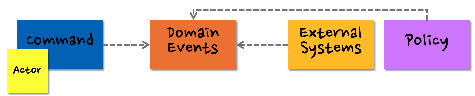 | - Command를 수행하는 Actor를 정의합니다. Actor를 Command의 왼쪽 하단에 겹쳐서 붙입니다. - "하늘색" Actor는 사람이며, 구체적인 사용자 유형을 적는것이 좋습니다. - Event 발생과 관련된 외부 시스템이 있다면 Event의 우측 상단에 겹쳐서 붙입니다. - "초록색" Command의 요청을 받아 데이터만 제공해 주는 경우도 있고, 직접 무언가를 처리해서 결과를 리턴하는 외부시스템도 있습니다. 또한, 외부 시스템은 Command 없이 Event를 발생시킬 수도 있습니다. (예: '푸시알림이 도착했다.'라는 이벤트는 '카카오톡'같은 외부시스템이 Command 없이 발생시키는 이벤트입니다.) 외부시스템이란 현재 시스템 밖에 있는 시스템을 의미합니다. 회사 내 시스템일 수도 있고, 회사 외부에 있는 시스템일 수도 있습니다. - 이벤트와 관련된 정책이나 규정이 있으면 Event 우측 하단에 붙입니다. - "보라색" 그 이벤트가 발생하기 위해 사전 체크할 정책/규정(예: 이름, 이메일은 필수 정보)이나 이벤트 발생 시에 정책/규정(예: 주민번호 뒷자리는 마스킹 처리)을 적습니다. 또한, 정책(Policy)이나 규정(Rule)은 Event를 발생시킬 수 있습니다. 보통 이러한 정책/규정은 시간과 관계가 있습니다. 예를 들어 "매월 말일에 1개월 내 만기가 도래하는 고객 리스트를 전 영업직원에게 메일로 통보한다."라는 Rule이 있다면 이 Rule도 "1개월 내 만기 도래 고객 리스트가 통보되었다"라는 이벤트를 일으키는 Trigger가 됩니다. |