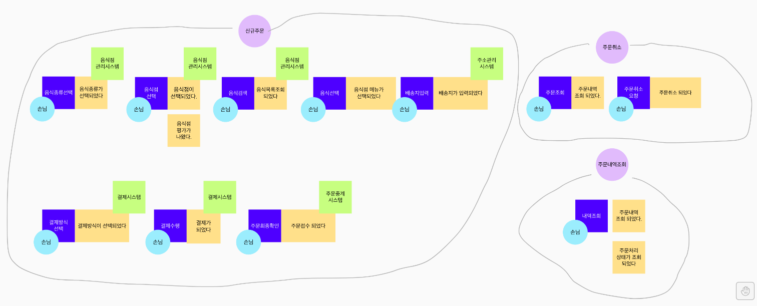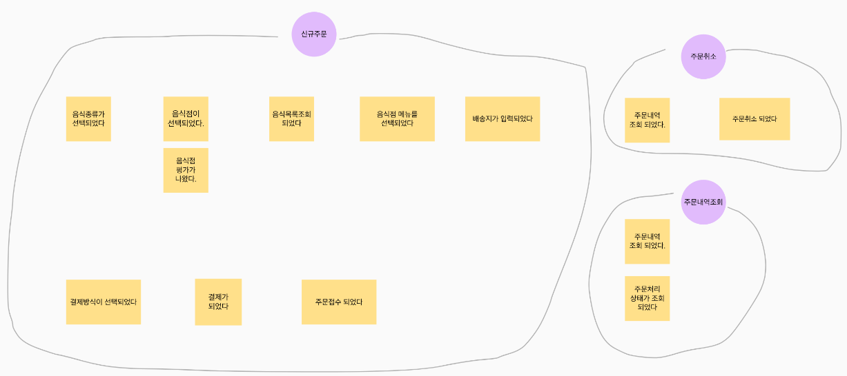 2) 전략적 설계를 위해 Business Domain의 상황(Context)을 Event storming으로 공유하고, 비즈니스 목적별로 서비스들을 그룹핑합니다.
