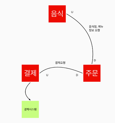 아래 예제는 주문서비스가 음식서비스에 음식점과 메뉴 정보 요청을 하고, 주문서비스가 결제서비스에 결제를 요청하는 관계를 표현한 그림입니다.